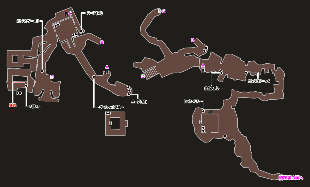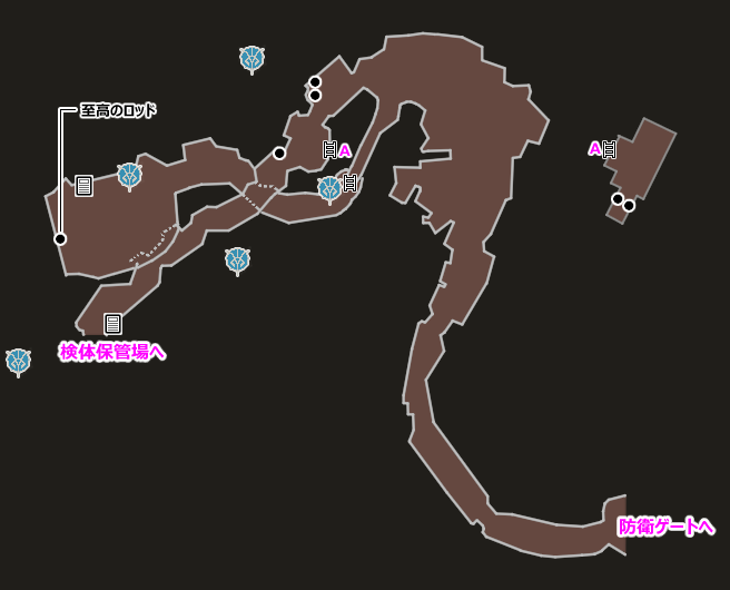 遺跡断崖から検体保管場に入ってすぐの通路ではリヘナラドールの入った袋が吊るされている。しゃがみで通れば出現させずに通り抜けられる。