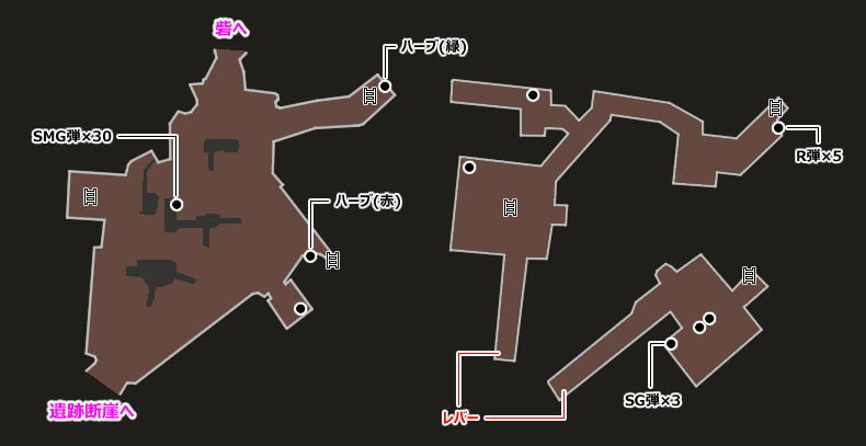 このハンドル付近にある木箱前の袋からはリヘナラドールが出現するので、木箱を迂回するか遠くから銃で木箱のみ当ててしゃがみで通ると出現させずに通れる。また、難易度HARDCORE以上では部屋の入口側の袋からも1体出現するので袋に当たらないようにしゃがみで通ると良い。