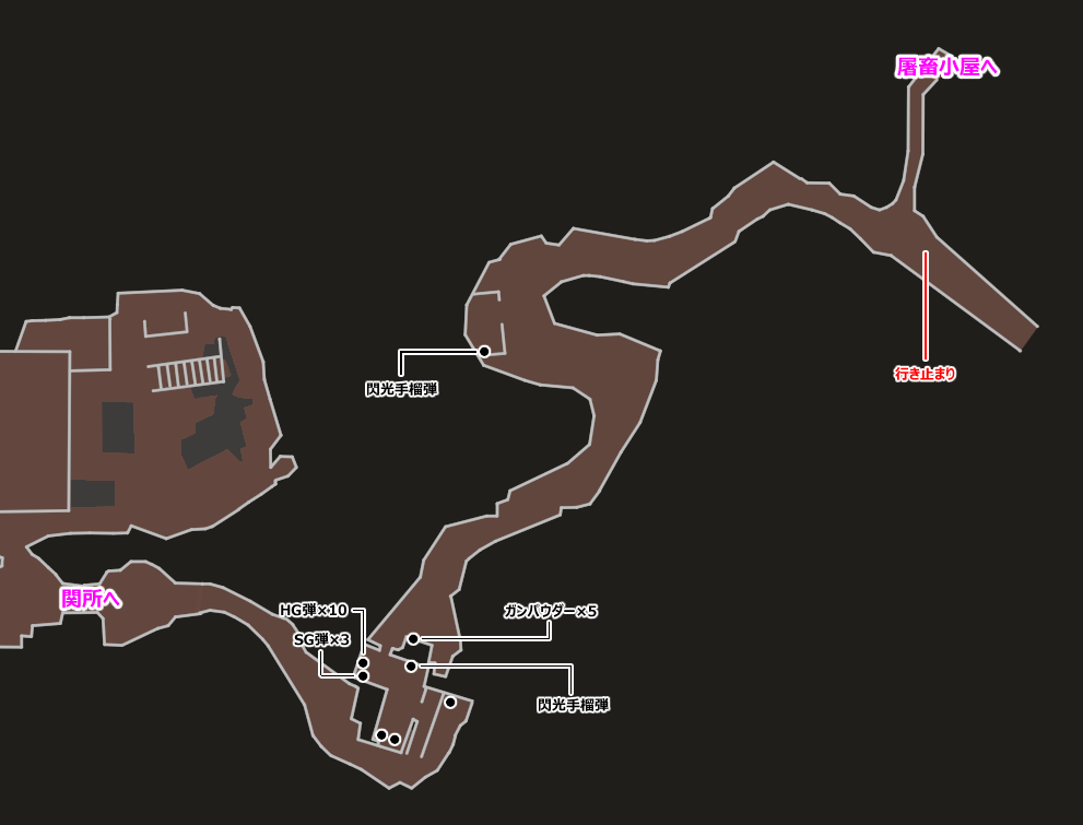 関所の奥の建物内1階にある関所のクランクを調べるとチェーンソー姉妹が出現する。そのため、事前にロッカーにアシュリーを入れておくと良い。