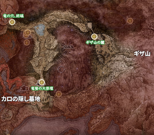 祝福「竜餐の大祭壇」から巨大な竜の死骸を南西側へ越えて、赤い花が咲いている場所を進んでいくとカロの隠し墓地に入る。