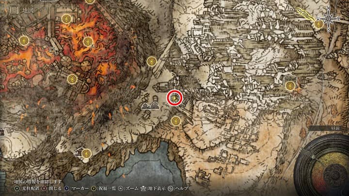 | ゲール砦の北 | 祝福からすぐ東の透明スカラベ | 戦灰「赤獅子の炎」 |