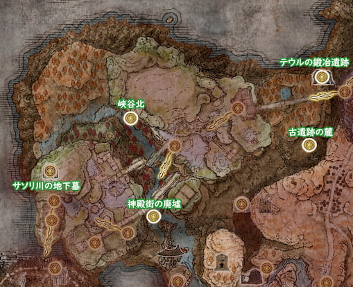 地図断片がある場所から南西へ進むと神殿街の廃墟があり、廃墟の北西には祝福「神殿街の廃墟」がある。