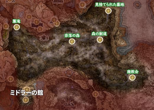 もしくは祝福「奈落の森」から進行ルート②で進んでいき、濃霧地帯から出たら北西方向に行くと辿り着く。