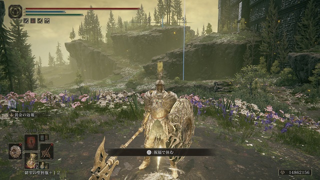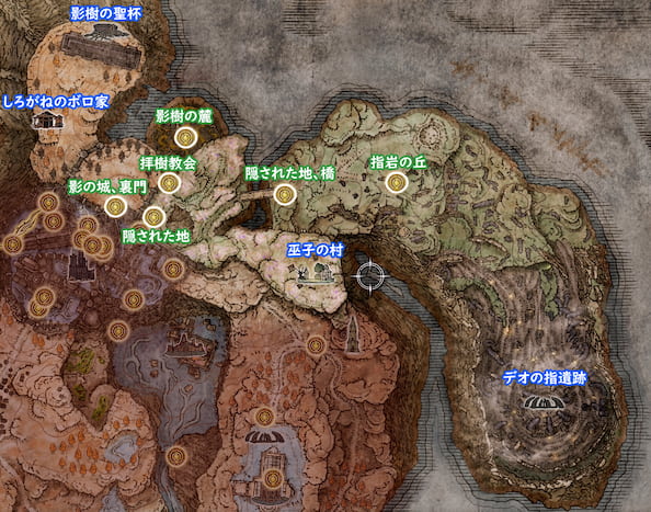 | 祝福された骨片 | 一体目のツリーガードが出現するところのY字路を南に登った高台、巫子の村のロケーションアイコンから真西 | 採取、計4個(影の城に近い高台に1個、巫子の村に近い高台に3個) |