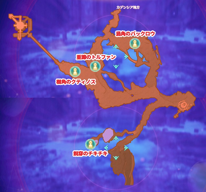 | 渦角のバックロウ | 56 | ザンクの道 | コレクション ・オリエスの双角 ・オリエスの頭甲 ・超高純度のジェムストーン アクセサリ ・金のはちまき ・ギリーマスク 貴重品 ・ノポンコイン・金 ・ノポンコイン・銀 ・謎の欠片・ひし形 |