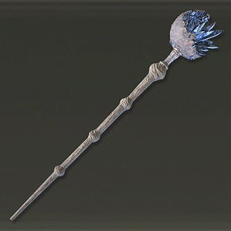 消費FPが1.5倍に増加する代わりに、知力のみで魔術補正が決まる杖の中で、最高の魔術補正を誇る杖。