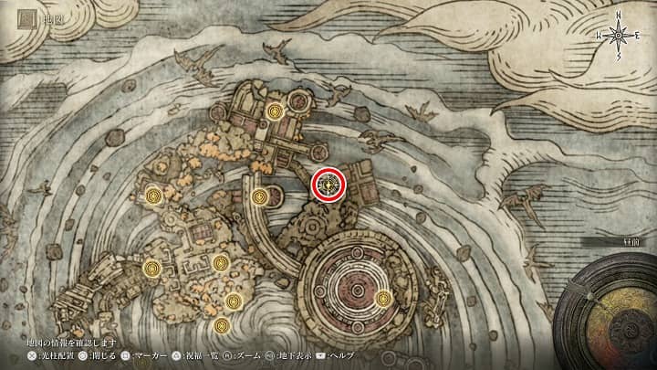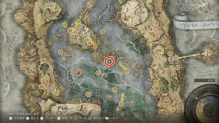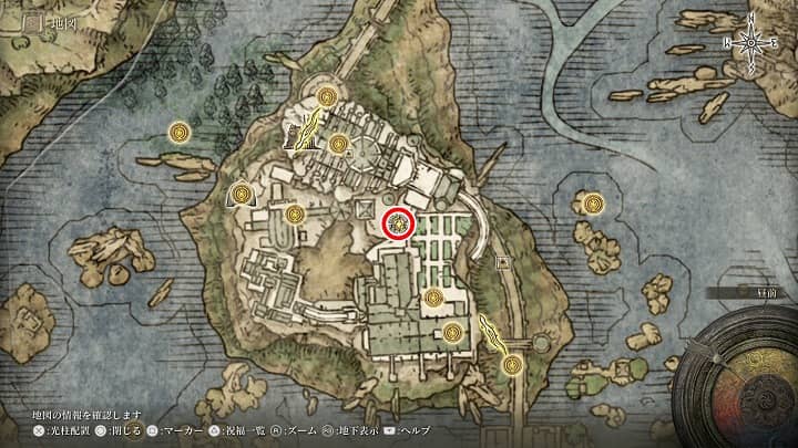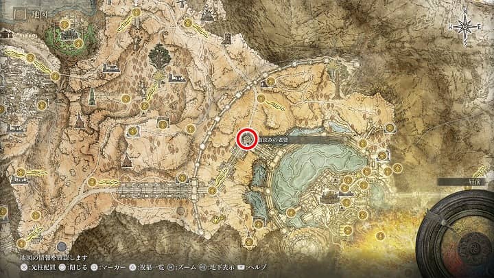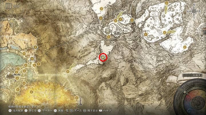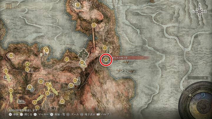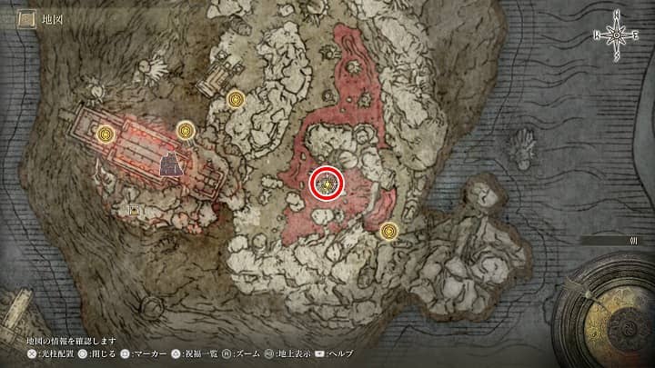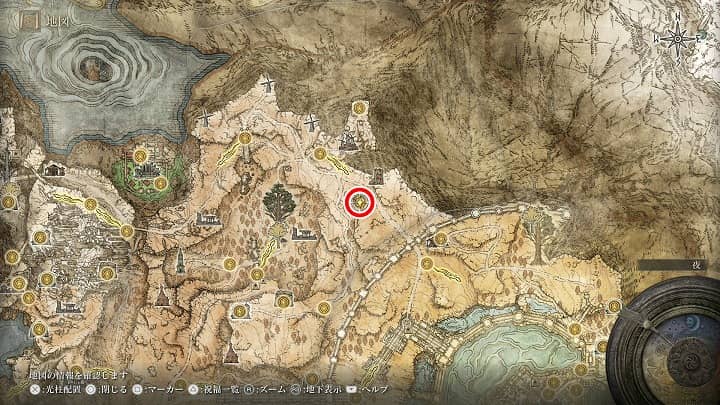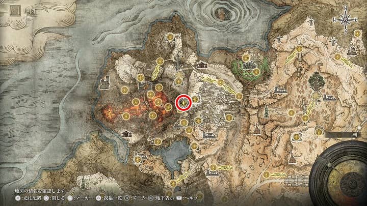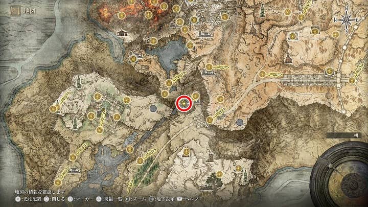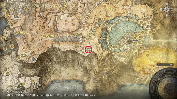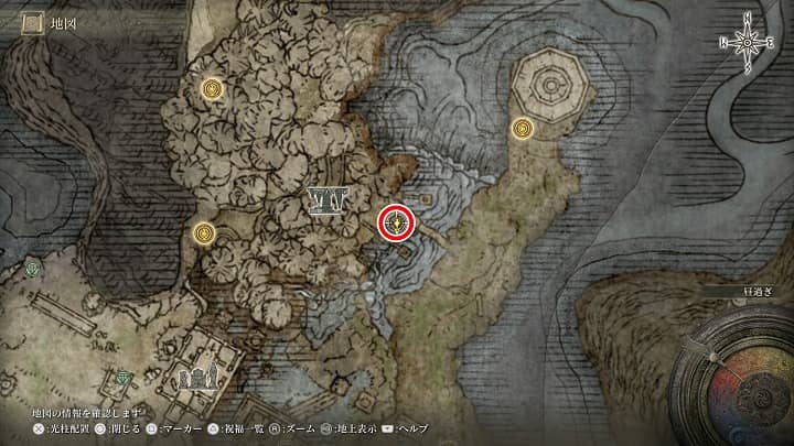 祝福から道なりに南西に進み、小黄金樹の北北西方向。