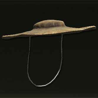 落葉のダンが被っている顎ひも付き帽子。つばが広くて頭頂部がぺったんこなのが特徴。
