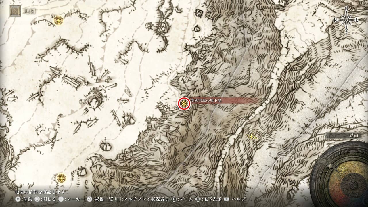 祝福「聖別雪原」から北東。吹雪で視界が悪いので、入口はかなり近づかないとわからないが、東の壁伝いに北上してけば見つかる。
