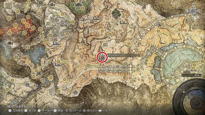 行き方はアルター高原の祝福「風車村」から南の道沿いを進んでいくと途中に祝福「城壁沿いの小道」がある。そこから南西の丘を下った場所にある。