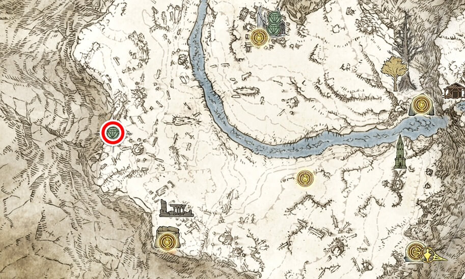 廃墟やや東付近はなぜか竜人兵の幻影が出現する。倒せない強さではないが、無限湧きであり倒しても獲得ルーン0なのでスルー推奨。止める方法も不明。