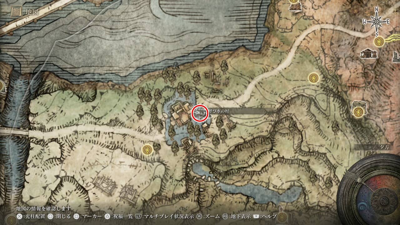 リムグレイブの北東にある祝福「呼び水村のはずれ」からすぐ東の水没した村。
