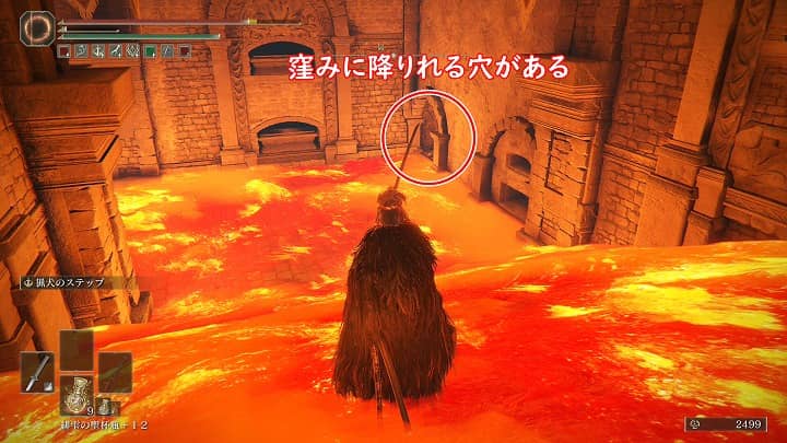 もう一つのショートカットとして、一つ目の戦車の坂を一番下まで降りて右側の穴から落ちる。こちらは溶岩地帯を抜ける際に多少のHPは減るものの、ローリング連打でも難なく抜けられるのでアイテム回収が必要なければオススメ。