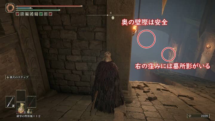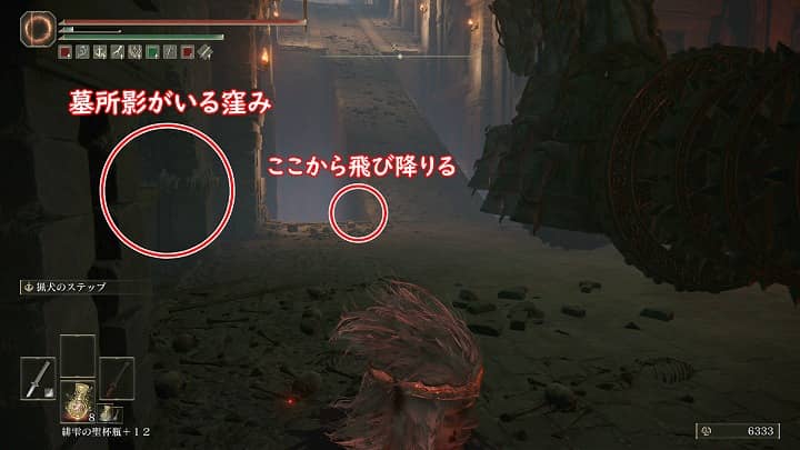 真っ直ぐ坂を一番下まで降りて右手の窪みには墓所影がいるので注意。奥の壁際も安全地帯。坂を降りきる途中、左右にある吹き抜けから下に降りることができるので、そこに降りて進む。